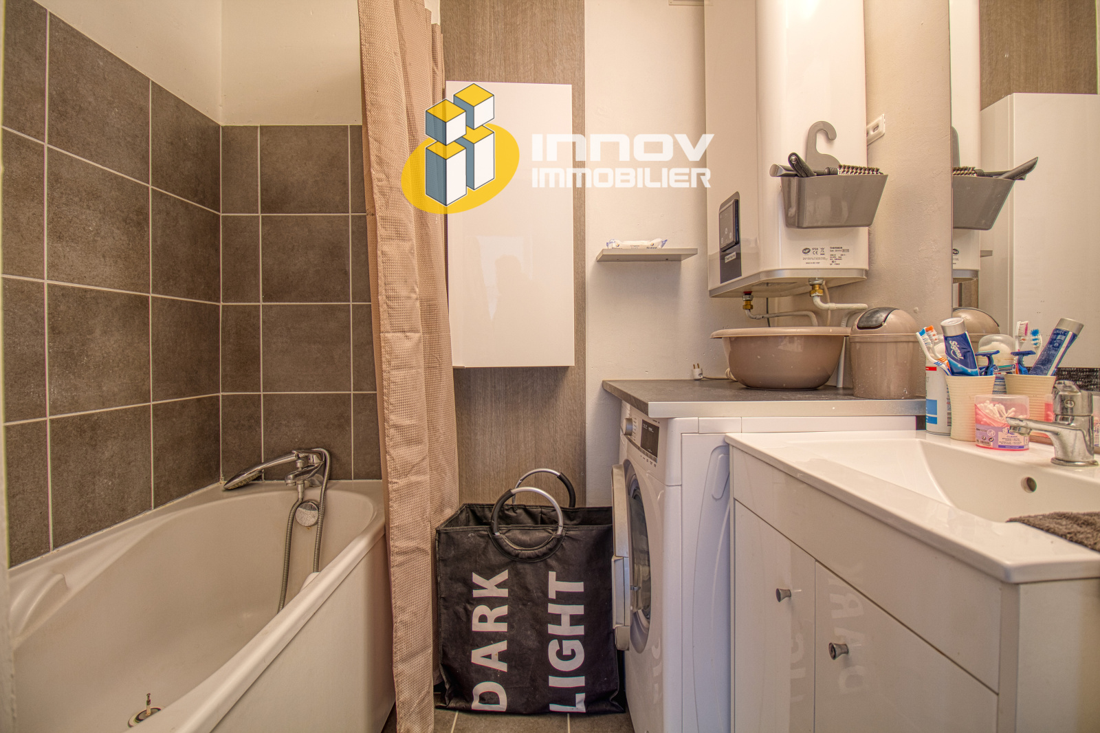 L’appartement possède une salle de bains équipée d’une baignoire, d’un meuble vasque, d’un espace pour la machine à laver et d’un cumulus récent.